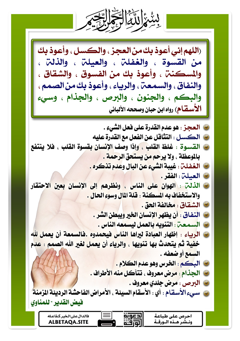 اللهم اعوذ بك من البرص والجنون والجذام ومن سيء الاسقام شرح دعاء اللهم إني أعوذ بك من العجز والكسل