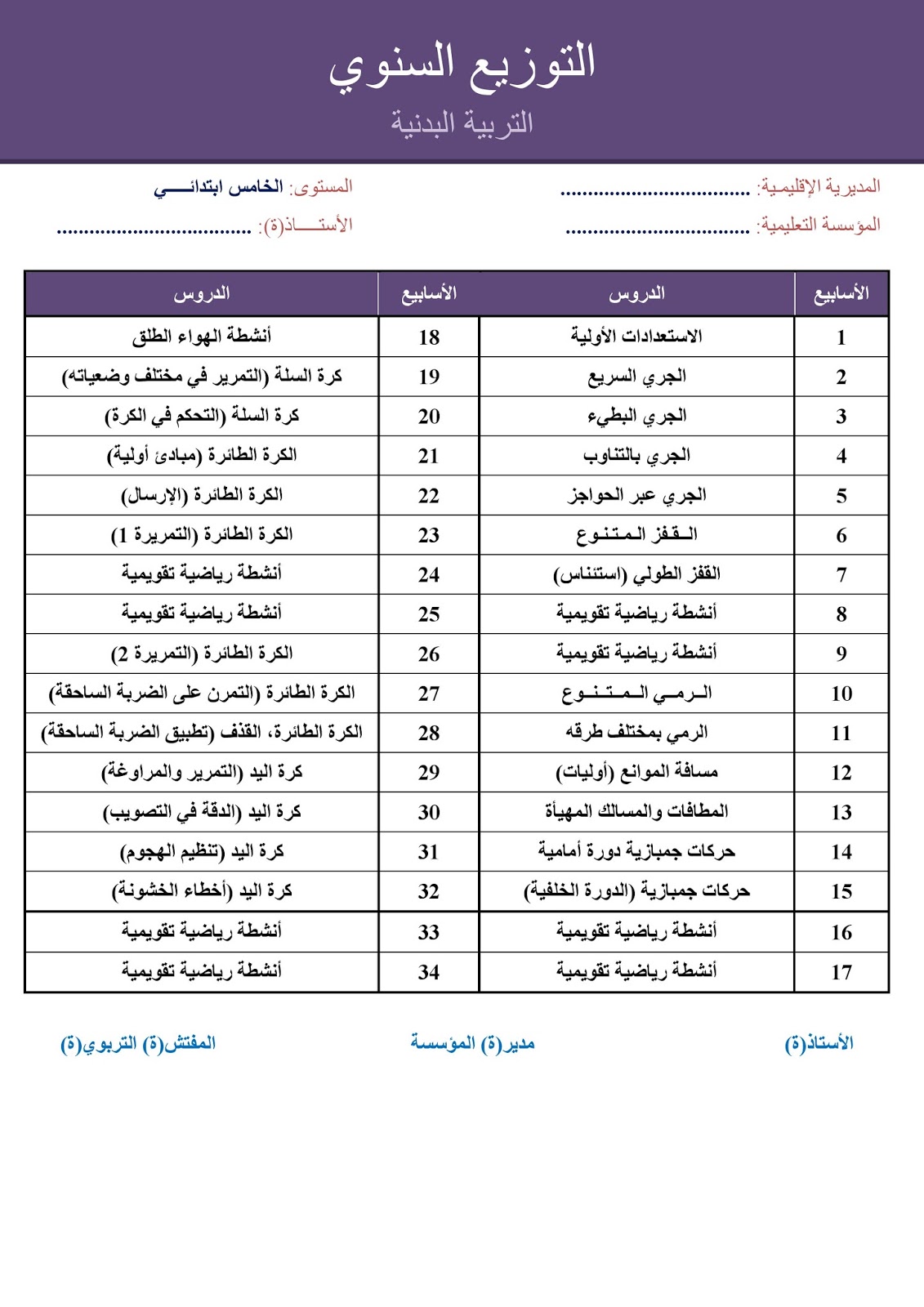 التوزيع السنوي التربية البدنية المستوى الخامس