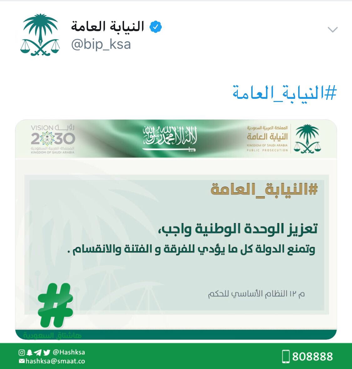 هاشتاق السعودية على تويتر النيابة العامة تعزيز الوحدة الوطنية واجب والدولة تمنع كل ما يؤدي للفرقة والانقسام
